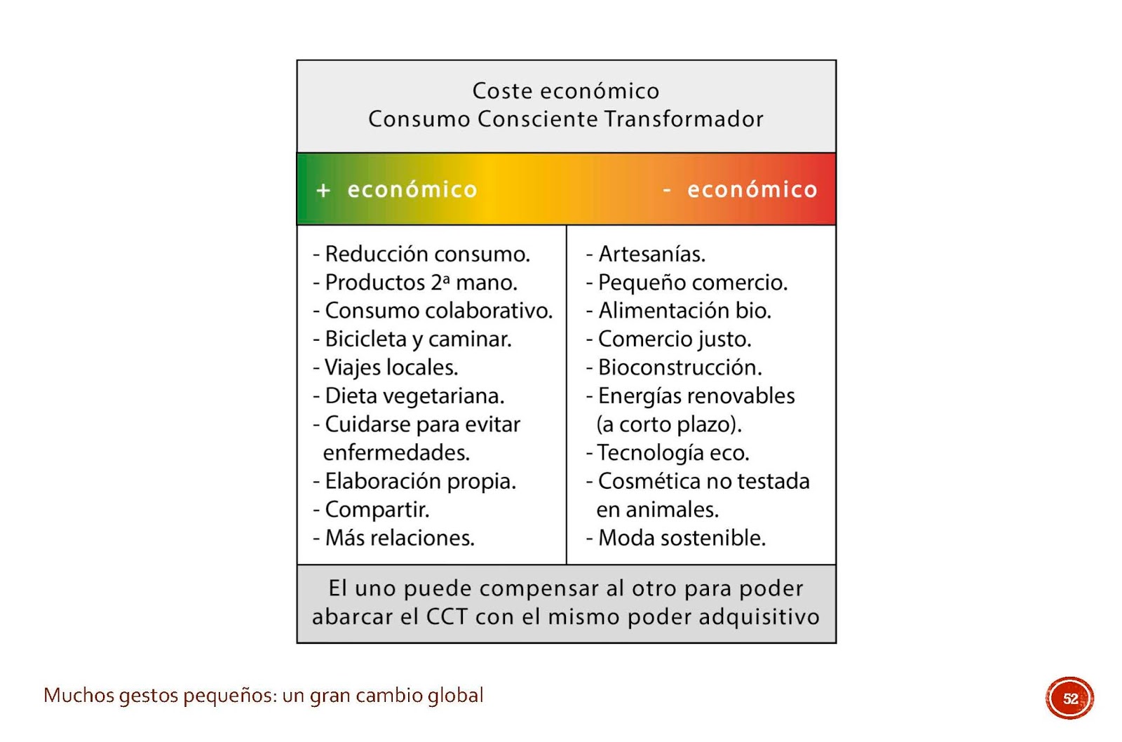 En el siguiente enlace que te mando observarás que hay aspectos del Consumo Consciente que no solo nos facilitan la vida sino que resultan más económicos. Es el caso de la columna de la izquierda de la imagen que mando. En el caso de la columna de la derecha es más oneroso. Y ahí es precisamente donde las clases con mejor poder adquisitivo pueden hacer valer su activismo. En la medida que haya más demandas de esos productos más «caros» irían bajando los precios. Cada cuál solo está llamado a practicar esta potente herramienta adaptada a sus circunstancias y posibilidades. Y siempre podemos hacer más de lo que creemos. Iniciarse en esta «filosofía» descubre más posibilidades de las imaginadas. Información+reflexión+voluntad.